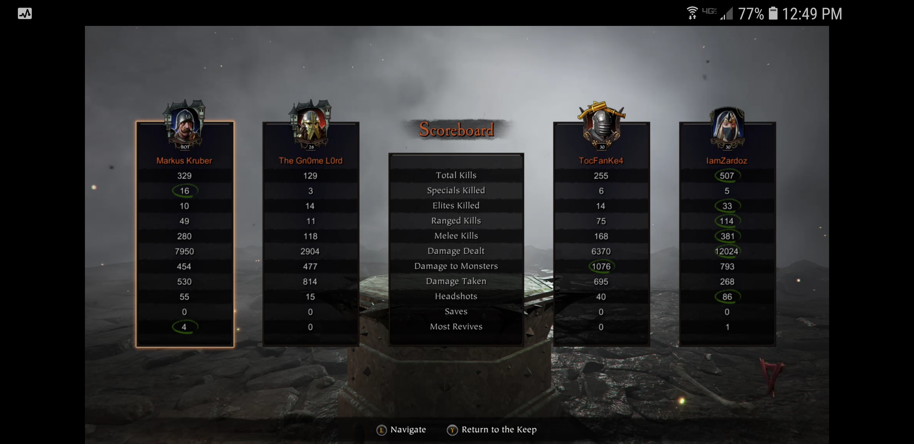 Attached is the screenshot my friend saw (he was Kerillian, and I was Saltzy) and a cell phone cap I took off my Xbox app. On my screen I did 6370 damage, and he did 12k. On his screen he did 2818 damage and I did 2349. The total kills are close, but seem to be one off for him and Kruber, two off for my other friend in the dwarf. I believe I was the group leader for this match.