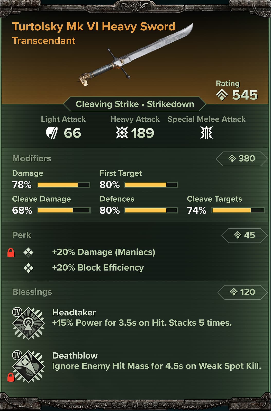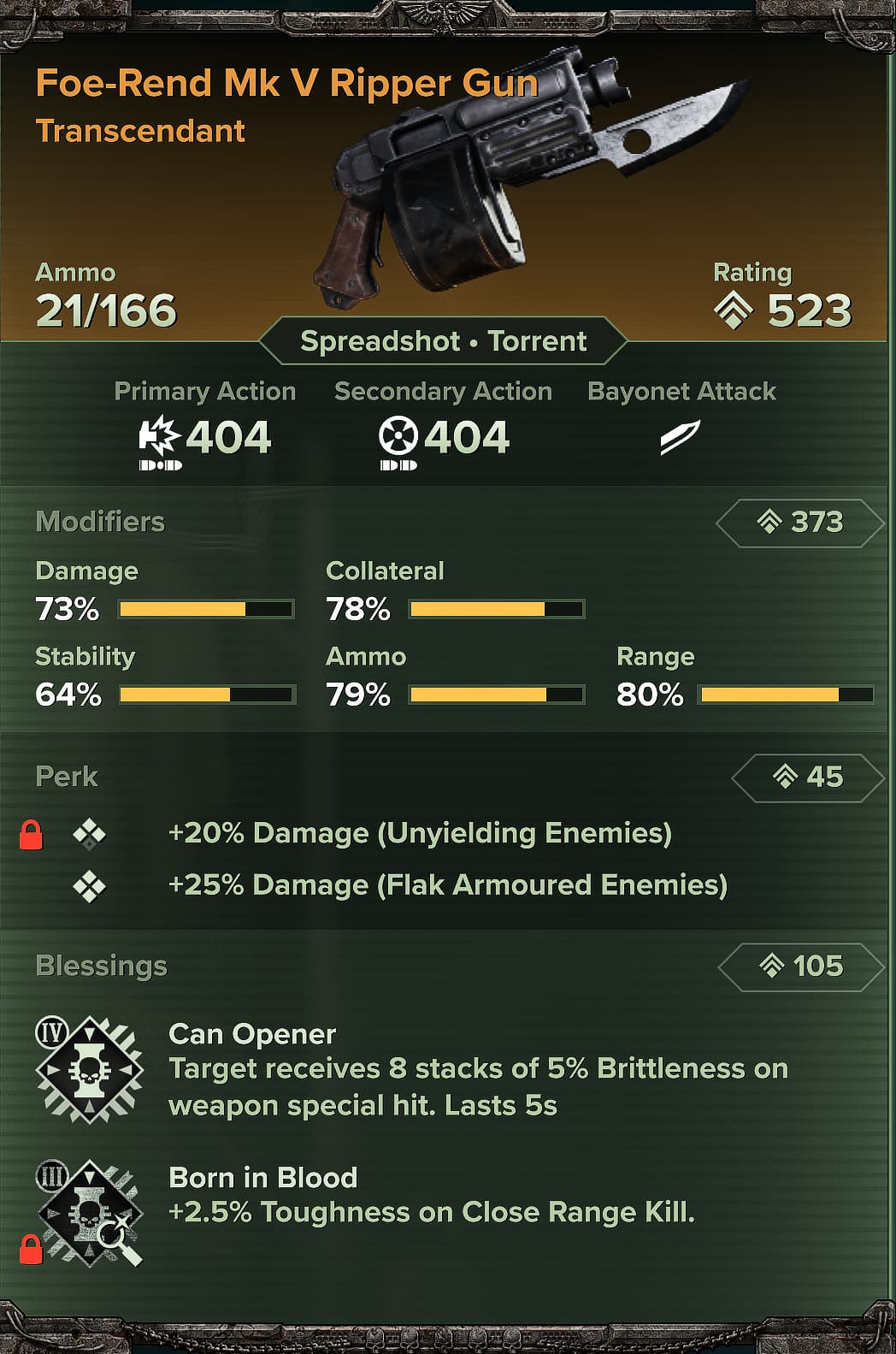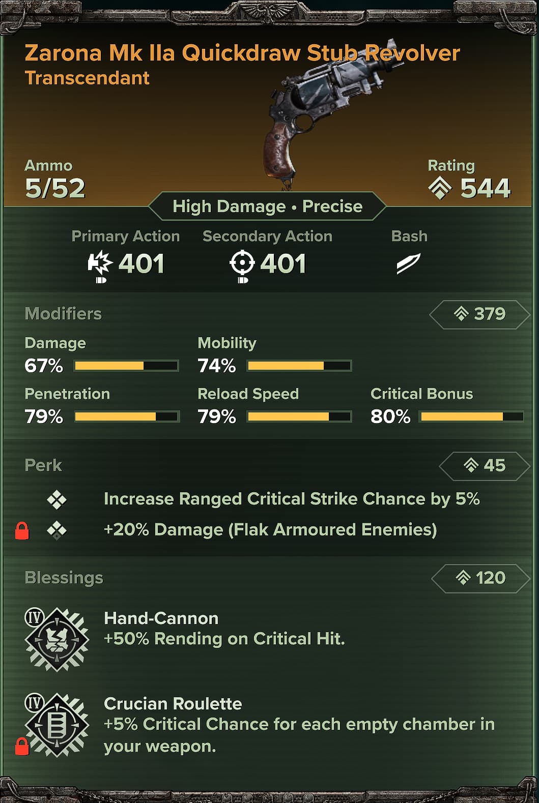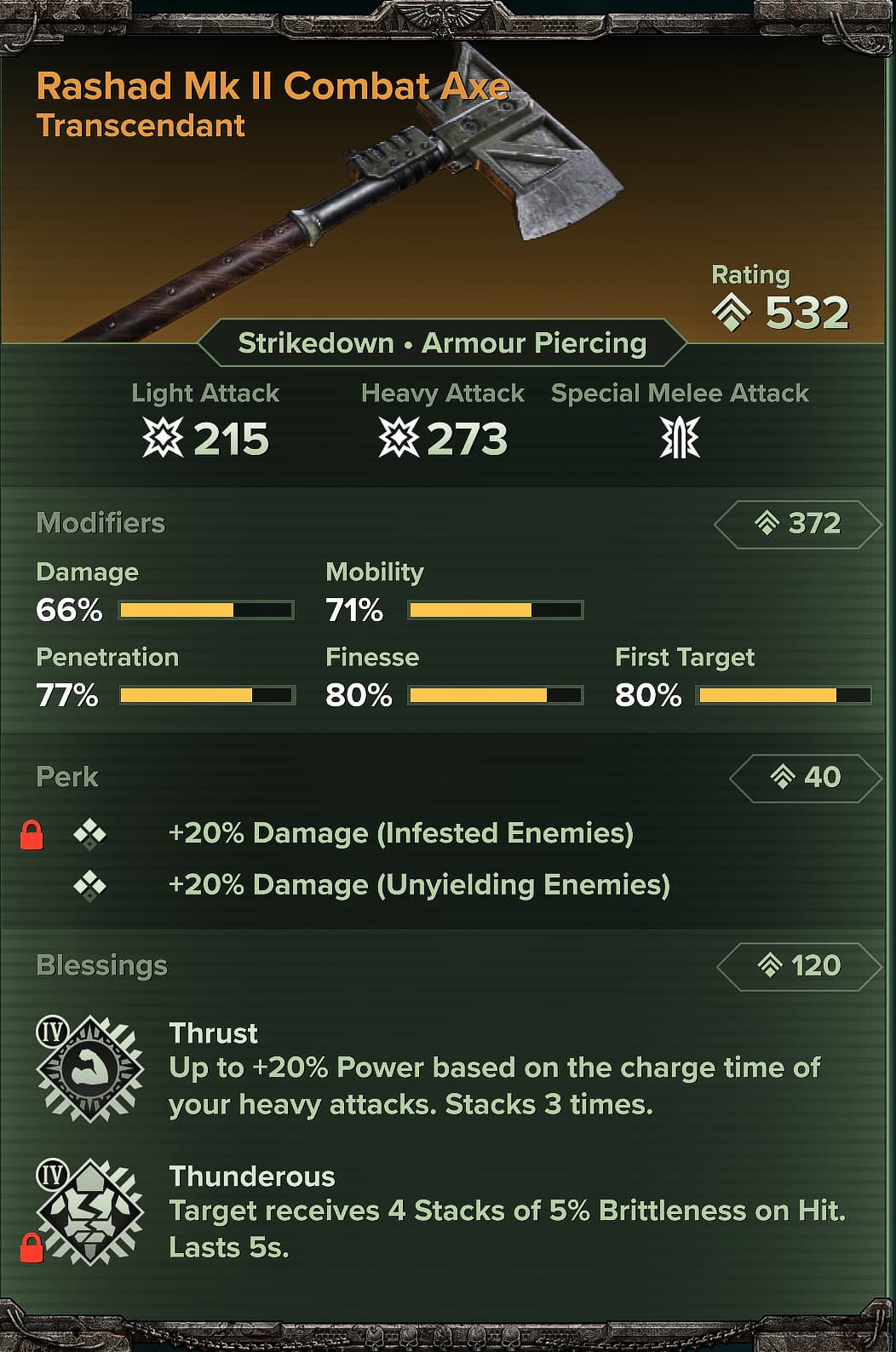So yeah the item system is trash, because at best I have some weapons with 1 locked blessing that I like that I still can’t experiment with because of the awful perk rerolling. I have about a dozen ‘god’ weapons I won’t even bother finishing with now knowing a rework is coming, that have T4 flak or maniac or unarmored already. And that says nothing of weapons with more than 6 blessings total, basically required perks (headhunter autoguns and the shooters) and a bad system clearly designed to spit out certain outcomes less than others. That’s the only explanation I have for no thrust 4 on the thunderhammer despite like 70 crafted and months of Melk camping. I only recently got power cycler too.