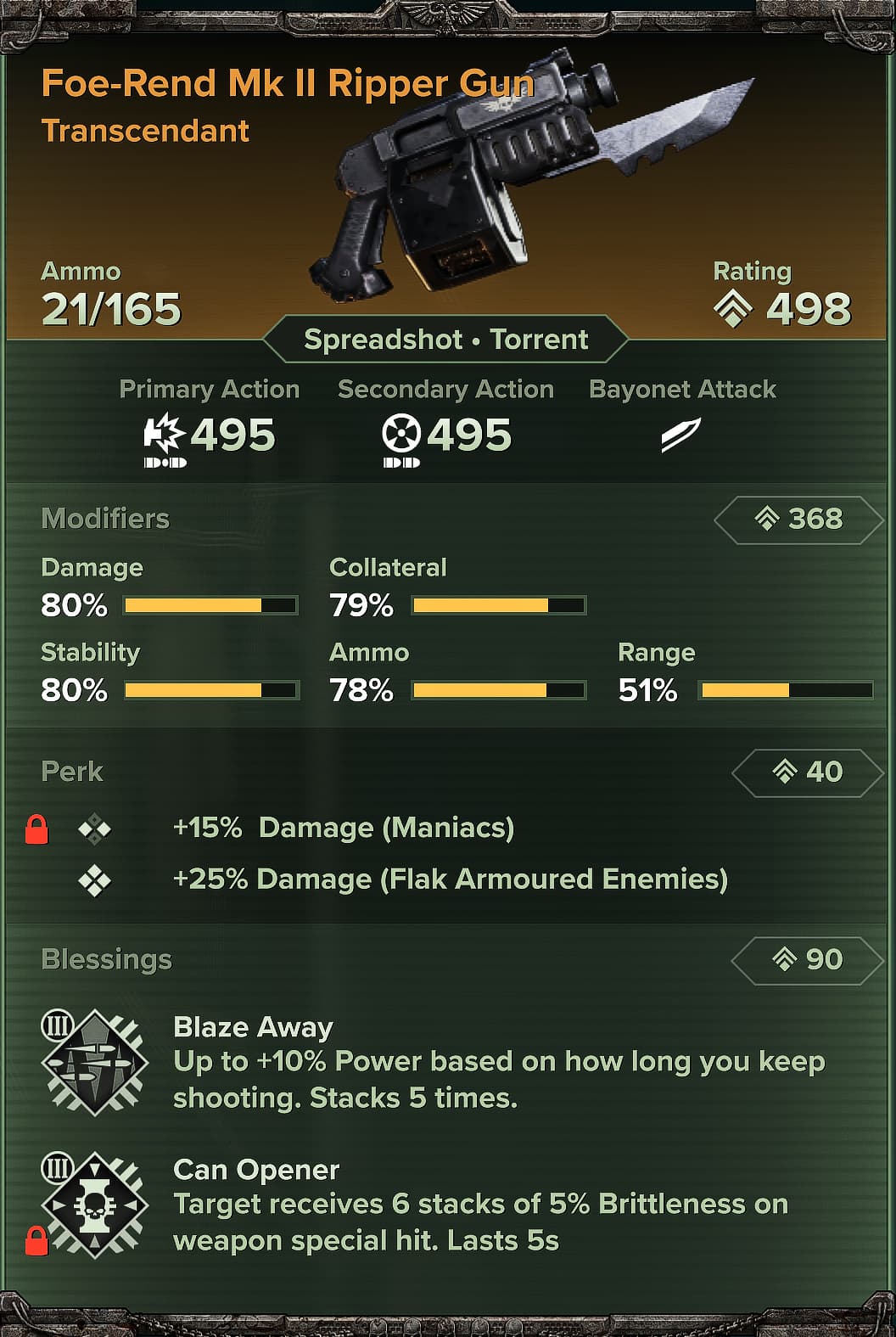 Yeah its even worse than that, this is an example of stale knowledge and blessings that are overrated. Blaze Away is literally only usable on the flamethrower, kickback and shredder, because everything else is too inaccurate. Especially Ripperguns, which as we have learned confirm a lot less pellets fired from braced than the hip. And the hipfire literally needs to wait almost a second before shooting again (another ogryn pro tip: with the recent wield time buffs for Rippers, swapping is faster than recoil reset). To make matters worse if your Ripper 6 has an ammo stat giving it over 20 rounds, it won’t even proc anymore from M1.