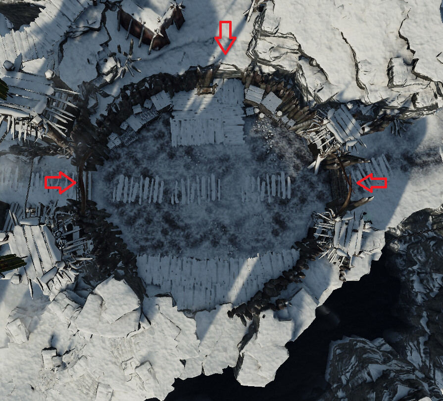 Ideally I imagine the spawn points of the Gatekeeper would be random between one of the two gates and the chaos warriors could be randomized between the points shown in the image below.