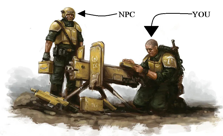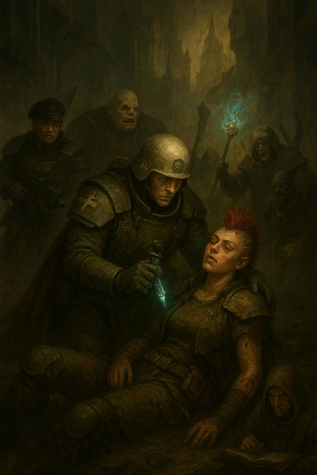 Administratum personnel are routinely pressed into service during crises, especially in hive worlds like Tertium where manpower shortages and mass casualties are constant.
