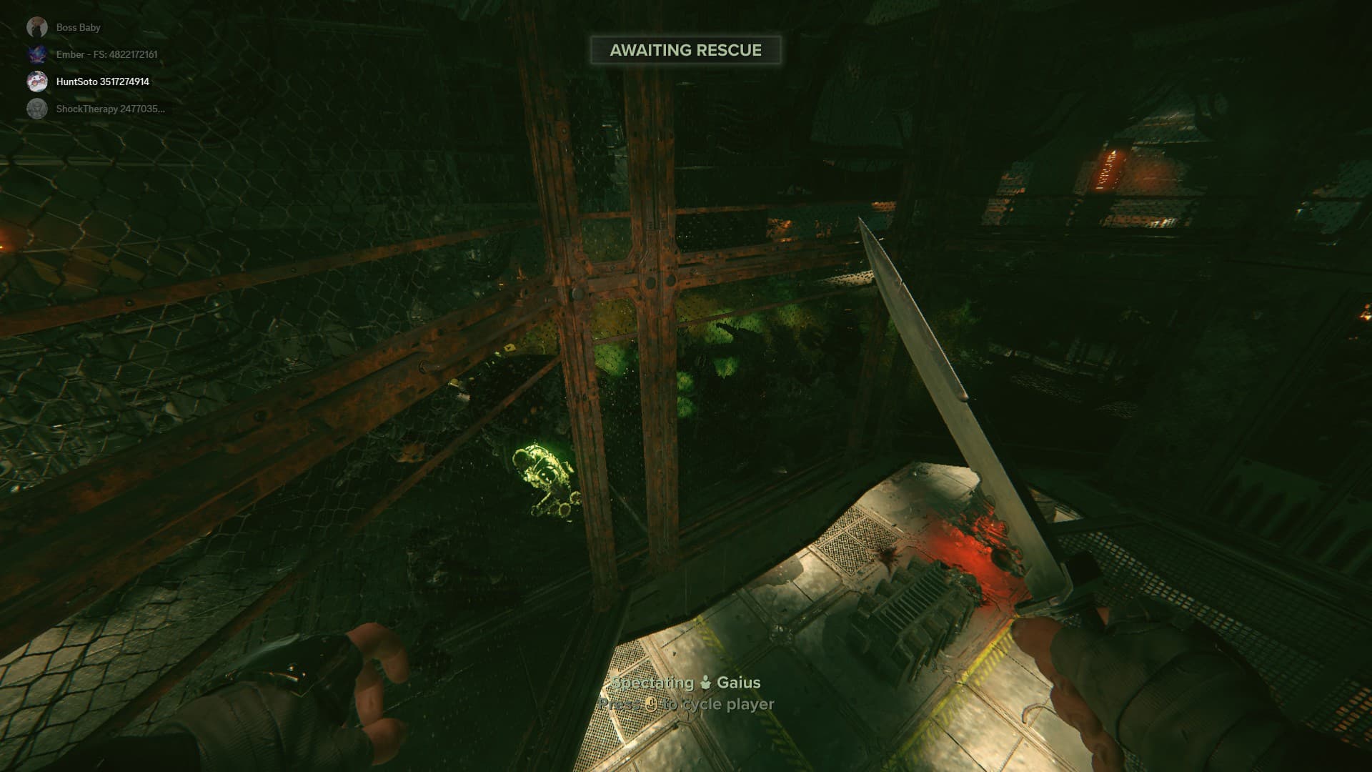 A mutant caught me as the elevator was ascending in Refinery Delta-17. After it threw me I was stuck in the elevator floor, just bouncing around while the game tried to find stable ground. After I tried moving around I got stuck on the second to last floor of the elevator, the one where players drop down and continue the mission after the med-station room.