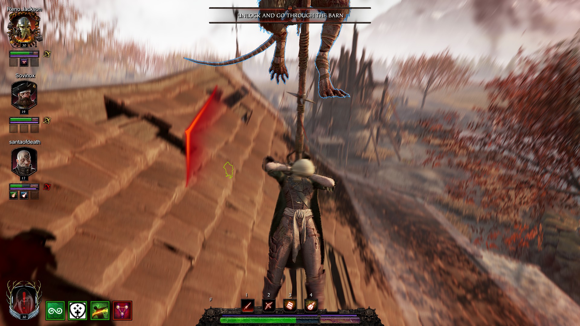 While attempting to attack a packmaster that is towards the lower end of the stairs in the barn that is immediately after the mandatory boss battle from the upper end of the stairs with Kerillian’s glaive.