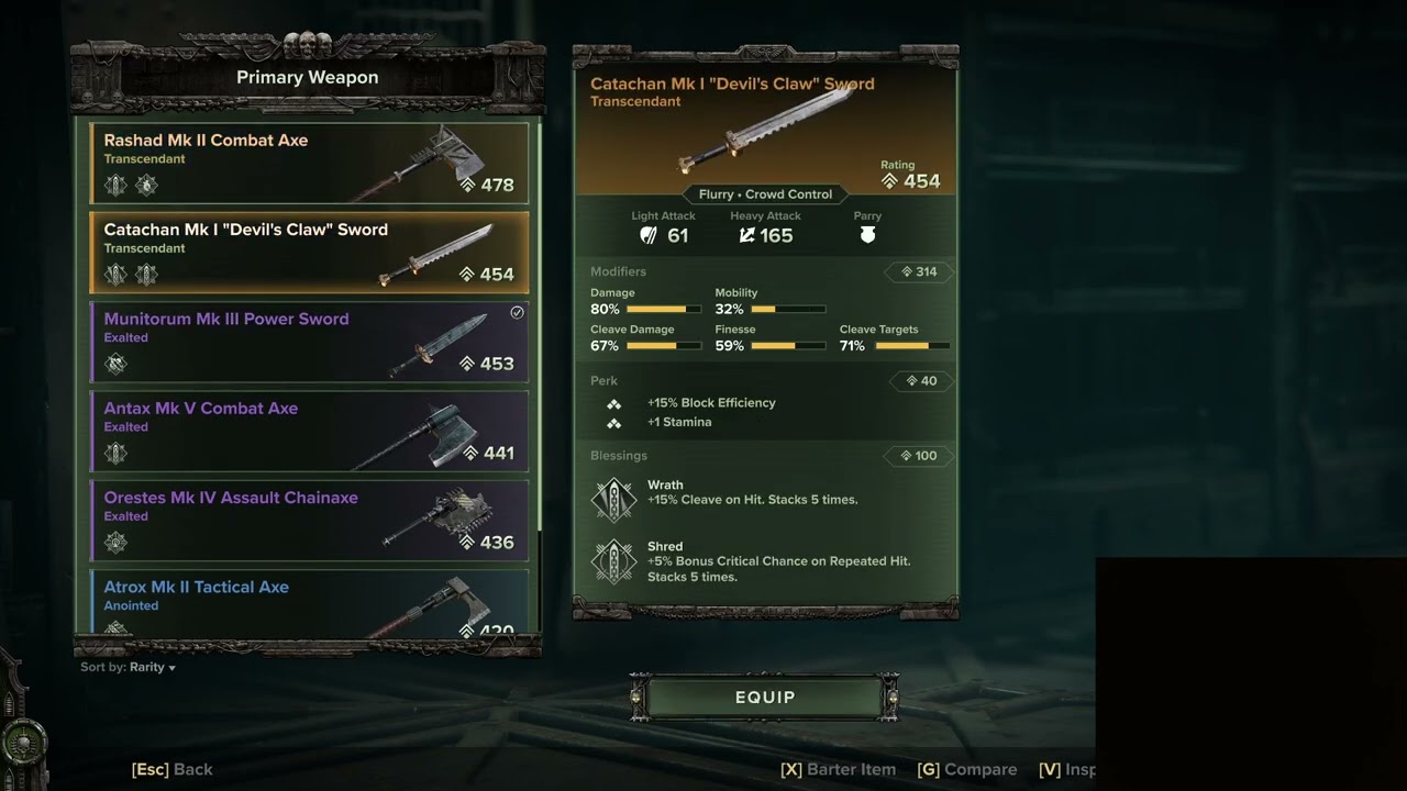 the thunder hammer should be for penetrating armor. I noticed a recent nerf to the chainaxe that slowed down its attack speed, i don’t think this is a good idea since the weapon should be good at managing mobs … the chain axe shoul operate as excellent against unarmored average+1 against flak and poorly against carapace but probably better than the power sword oror chainsword OFFENSIVELY, it should in trade have a defecit in blocking the majority of axe type wepaons in 40k are unbalanced and poor at parrying. The thunder hammer really needs higher penetration on carapace and it needs its damage pulled way down …it makes enemies like the beast of nurgle, plague ogryn and even to a lesser extent the daemon host a walk in the park because it has to have such high base damage to affect its carapace targets. It also should cleave when energized not hyper physics the first thing hit.