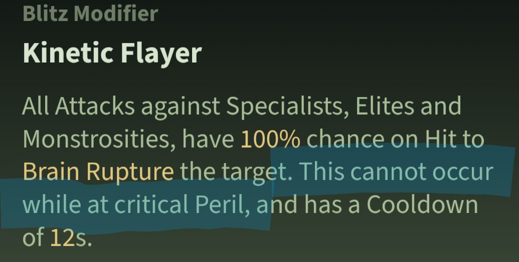 Also, there has been a bug in the game for ages whereby Kinetic Flayer would trigger upon a player hitting critical peril (97%+), but it won’t actually perform a brain rupture, but still goes on cooldown.