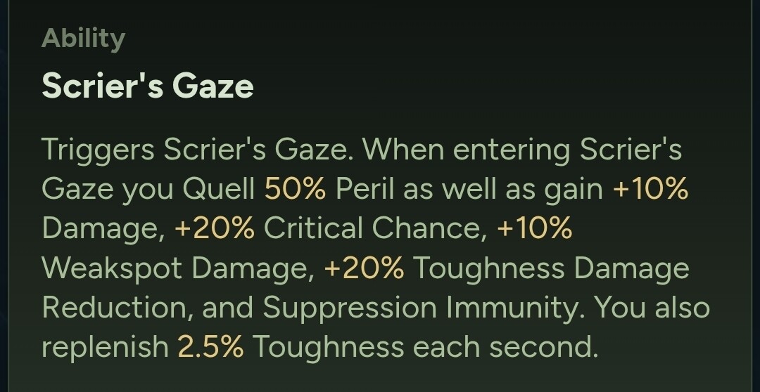 Translation: You immediately get 20% Toughness back with Quietude, you have a +20% Chance of dealing +30% Crit Damage with 15 Disrupt Destiny stacks (easy to maintain w/ Lingering Influence), you get +20% ability to face tank damage and you get an additional 37.5% Toughness back for just keeping Scrier’s up 15 seconds. Gunner and Reaper suppression also becomes a joke during Scrier’s.