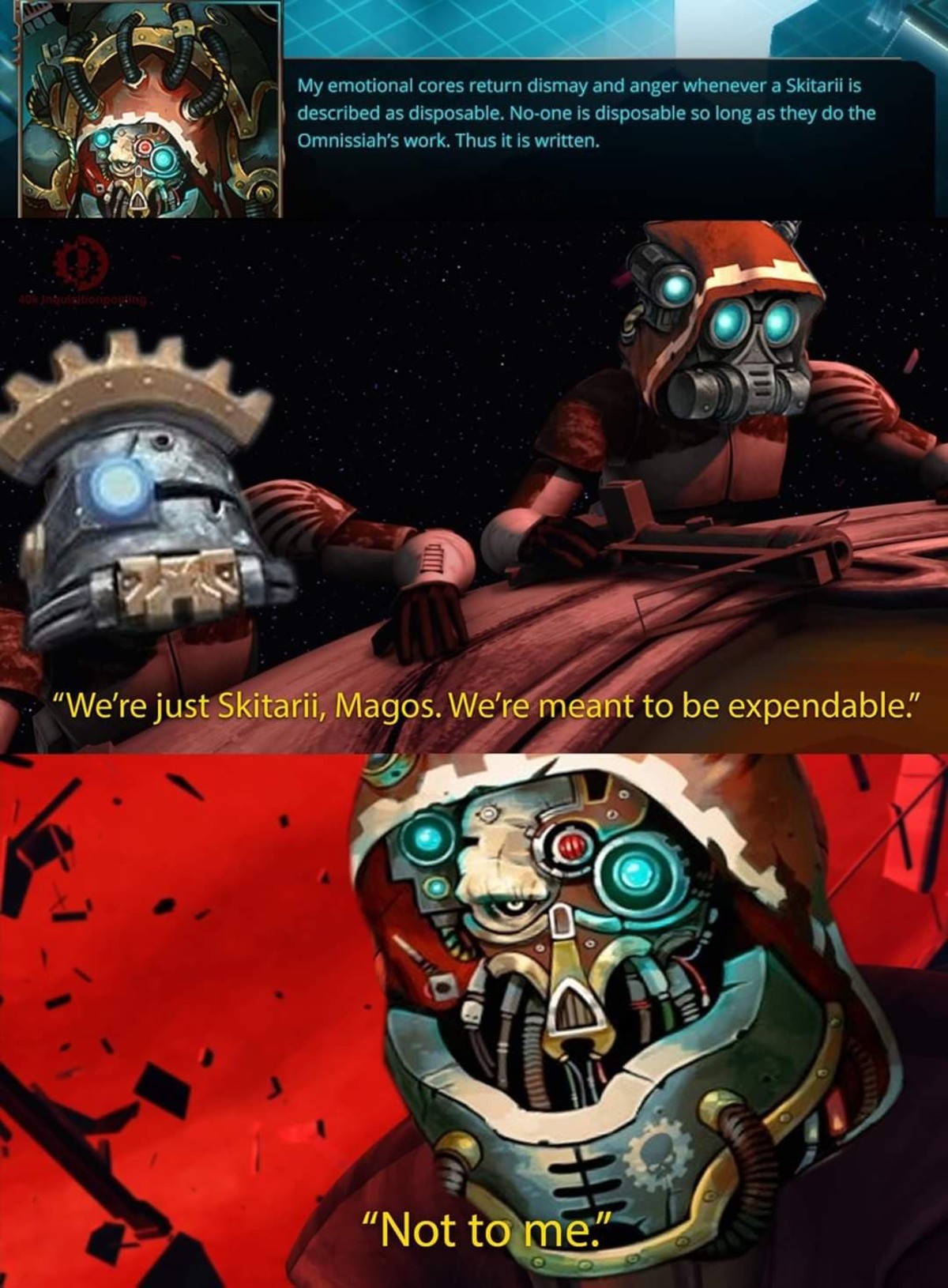 Pathos: the more emotional and kind or maternal type, kind of similar to the savant psyker, those who didn’t remove/restrict their emotions by their augmentations, and believe they’re outcasts from the Mechanicus for being too empathetic, especially towards organics, or not living up to the admech’s standards, and they view the rejects akin to a worried mother or a upbeat father having to deal with a bunch of jolly/unstable crackheads for children.